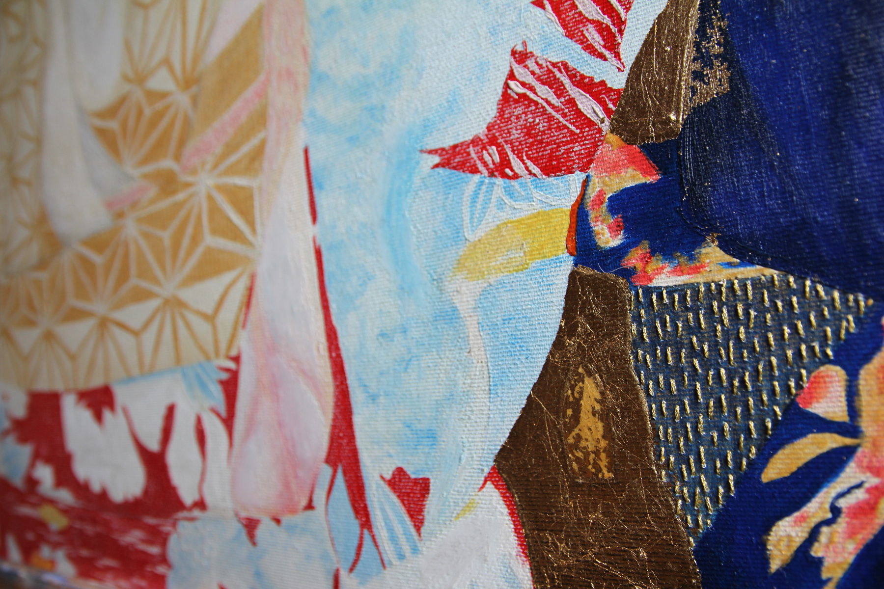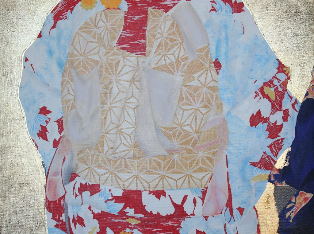 KIMONO oil colors, gold leaf, pastel pencils and embroidery on cotton canvas 70 x 50 x 3,5 cm unframed KIMONO olio, foglia d’oro, pastelli e ricamo su tela di cotone 70 x 50 x 3,5 cm senza cornice
